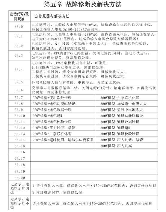 ER.0 :電機運行時,電源輸入電壓低于140VAC,請檢查輸入電壓和輸入連接線應保證在輸入電壓為150-250VAC范圍內。